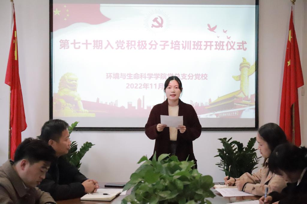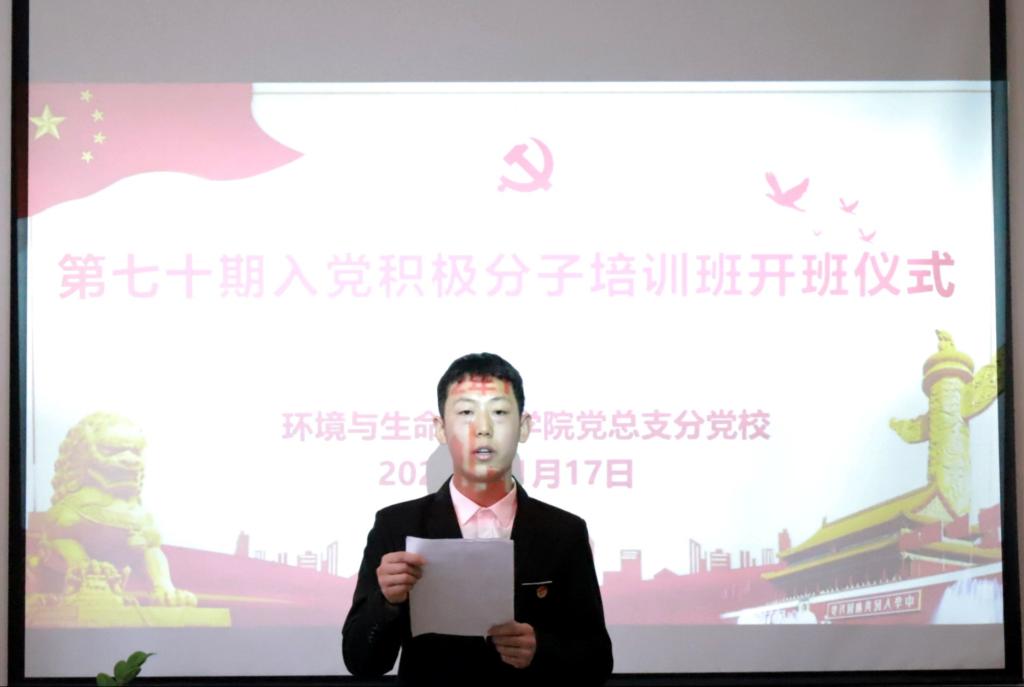 冯雨领学学校党委《关于举办党校第六十九期发展对象培训班、第七十期积极分子培训班的通知》;张小苗宣读《环境与生命科学学院分党校第七十期入党积极分子培训班培训安排》;曹乐就考核管理、学员纪律、培训注意事项等方面提出具体要求。