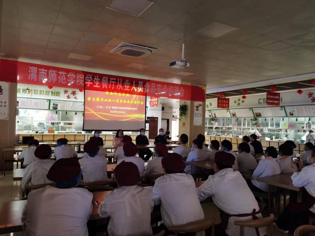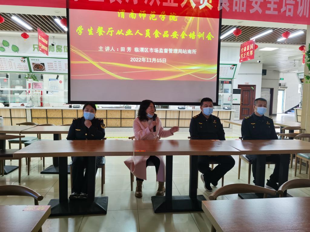 11月15日下午,后勤服务中心饮食管理科特邀临渭区市场监督管理局站南所田芳来校开展“学生餐厅从业人员食品安全培训会”。培训会由后勤服务中心办公室主任安幼薇主持。