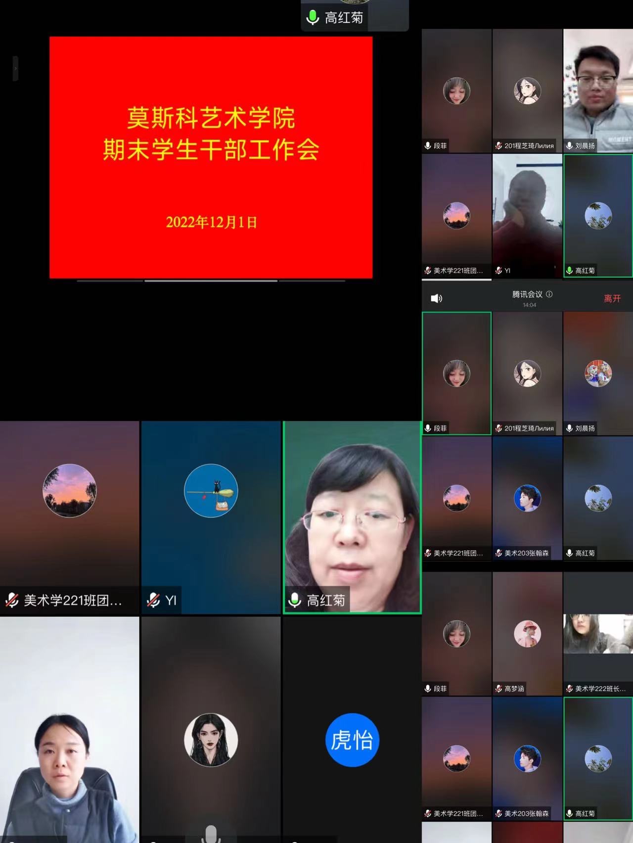 12月1日,莫斯科艺术学院召开期末学生干部线上工作会,安排部署近期的学生工作。莫斯科艺术学院党总支副书记叶晓燕,教学副院长高红菊、学工办副主任段菲、全体辅导员以及学生干部参加会议。