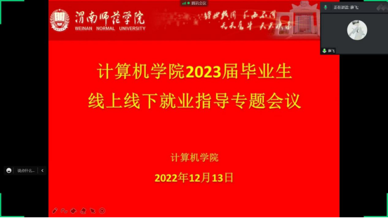 12月13日下午,计算机学院通过腾讯会议线上平台举行“2023届毕业生线上线下就业动指导专题会议”,学院学工办副主任李雷玮、毕业班辅导员薛飞及2023届全体应届毕业生参加大会,会议由李雷玮主持。