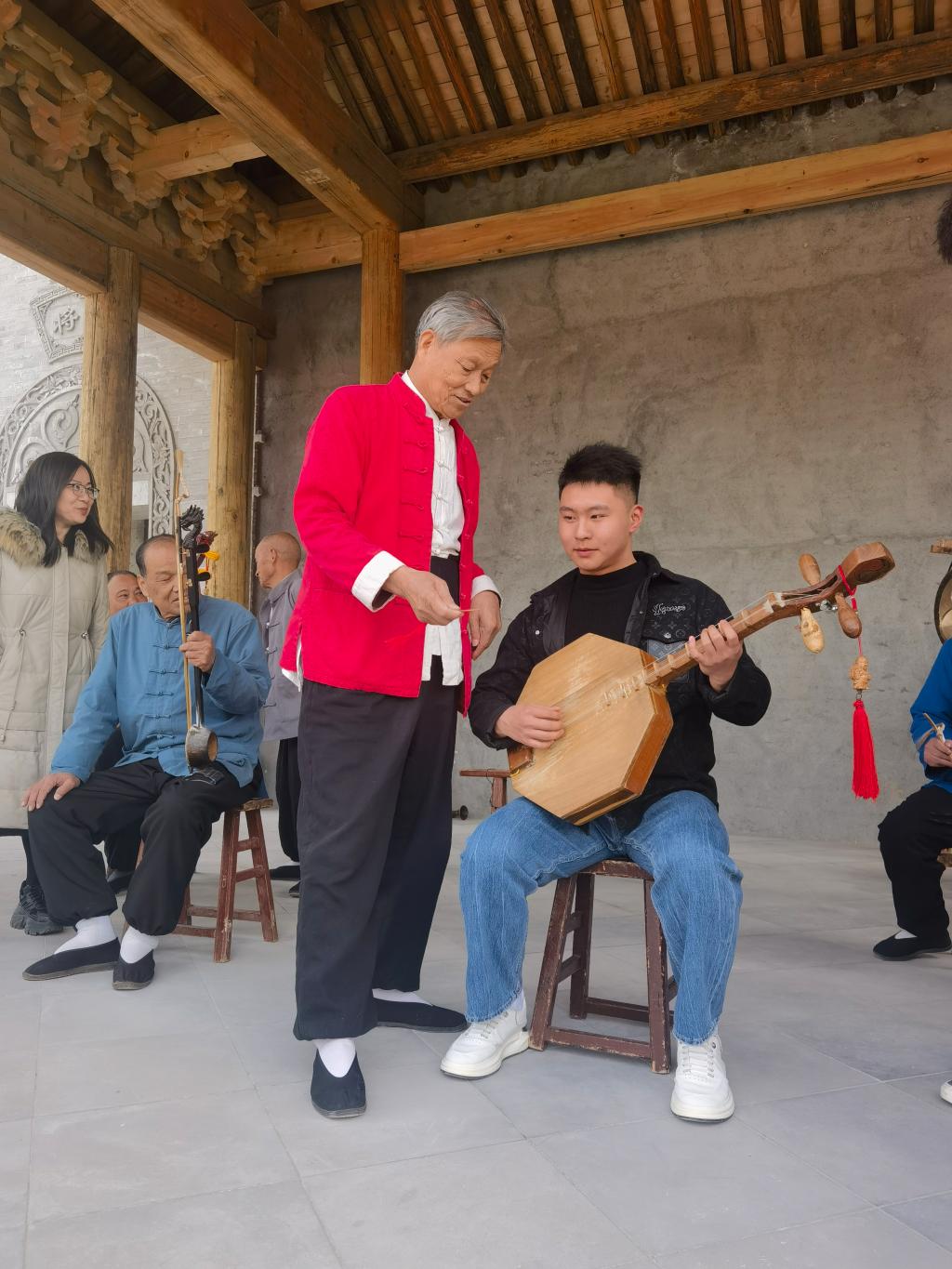 在老腔艺术发展保护中心主任柴文红、副主任李毅君的带领下前往华阴老腔传承基地参观交流。华阴老腔艺术团的老艺人们首先为师生们表演了华阴老腔经典唱段《将领一声震山川》,也以此节目作为师生们今天参观交流的开场仪式。