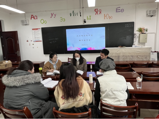 大学俄语教研室开展集体备课活动。集体备课一直是大学俄语教研室的优良传统,旨在加强教学交流,将个人智慧转化为集体优势,提高全体教师的教学水平,全面提升课程教学质量。此次集体备课教师们从语法、词汇、课文以及课程思政融入点等方面对《大学俄语》第二册第五课进行了详细的解析。全体老师各抒己见,共同研讨,从优化教学内容、创新教学方法、设计教学过程、融入思政元素等方面,探讨如何体现“学生为中心、产出为导向、持续改进”的理念,提升学生学习兴趣和主观能动性,提高教学质量,实现教学目标。