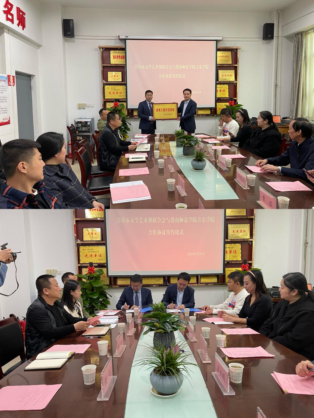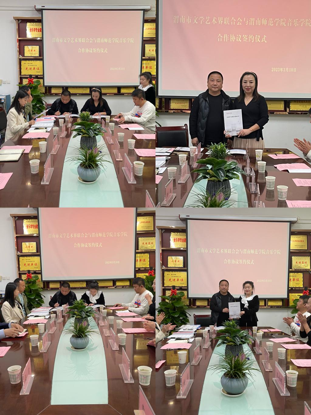 3月10日上午,音乐学院与渭南市文学艺术界联合会举行合作签约仪式。渭南市文学艺术界联合会主席张力、渭南市文学艺术界联合会副主席葛长明,bat365正版唯一官网音乐学院院长刘鹏、副院长逯克刚以及渭南市音协、舞协和师生代表参加此了次活动。