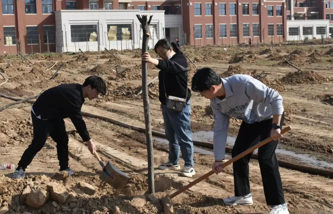 植树现场,学院领导带领参与植树的师生进行分工协作,大家热情洋溢、干劲十足。两三人一组互相配合,挖坑、植树、浇水、覆土、固定、手起锄落、放苗回填、提水浇灌……整个过程一丝不苟;各个环节衔接有序、配合默契,齐心合力栽下一棵棵树苗。经过一番辛勤的劳动,棵棵新树昂首挺立,为校园再添新绿。