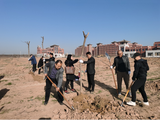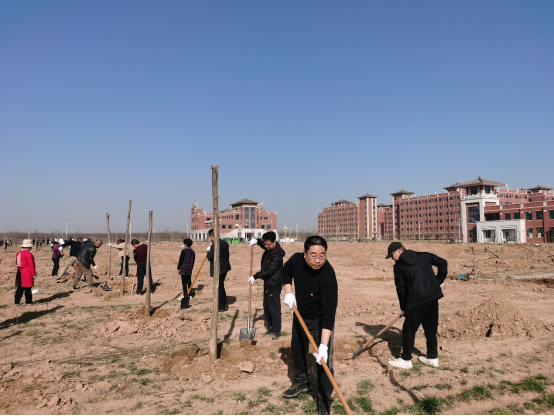 在富平校区,全体党员参与义务植树活动。党员同志或两人配合,或三人一组,分工明确、配合默契,扶苗定向、回填踩实、培土围堰、提水浇灌,程序规范、一丝不苟,圆满完成了植树任务。