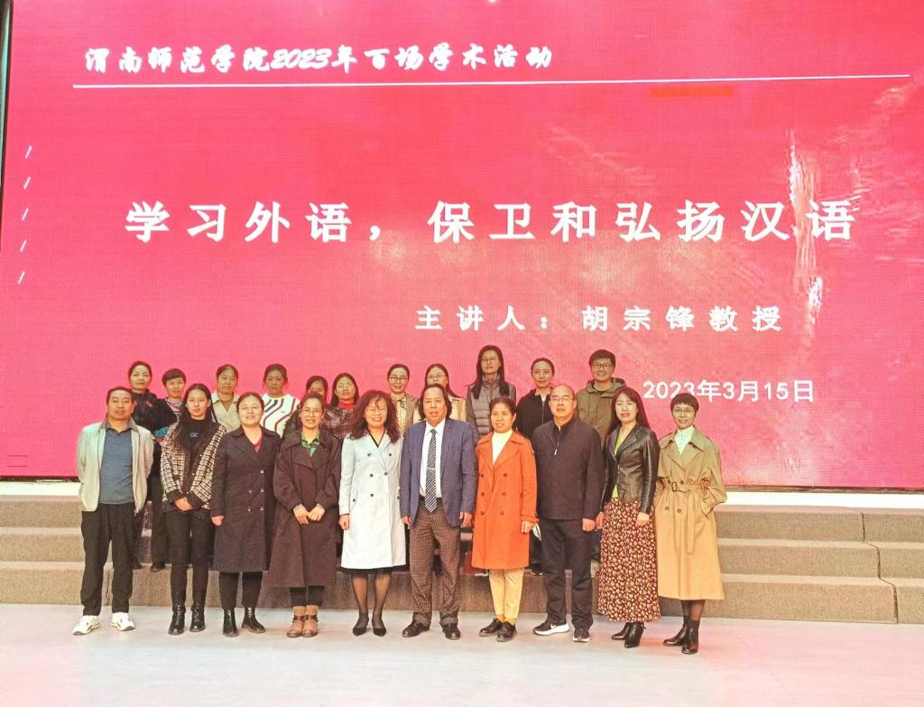 3月15日下午,外国语学院特邀西北大学原外语学院院长、陕西省翻译协会会长、博士生导师胡宗锋教授在陶然楼演艺厅为师生作了题为 “学习外语,保卫和弘扬汉语”的学术报告。报告会由外国语学院院长李海荣主持,学院无课教师及英语专业学生300余人参加了本次报告会。本次学术报告是bat365正版唯一官网2023年“百场名家学术活动”之一。