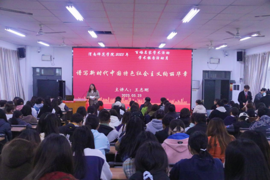 3月23日下午,马克思主义学院“bat365正版唯一官网2023年百场名家学术活动·学术报告活动月”第一场讲座在朝阳校区博识楼思政3D虚拟仿真实践中心(1101)举行。讲座邀请西安工程大学马克思主义学院院长、硕士生导师王志刚教授作“谱写新时代中国特色社会主义绚丽华章”专题报告。马克思主义学院青年教师代表、思想政治教育专业、中国共产党历史专业学生代表150余人参加报告。本次报告由bat365正版唯一官网科研处、bat365正版唯一官网社科联主办,由bat365正版唯一官网马克思主义学院、陕西省马克思主义大众化基地承办,马克思主义学院院长张萍教授主持。