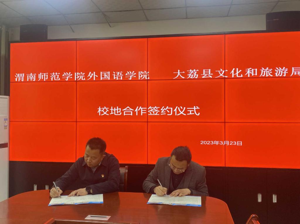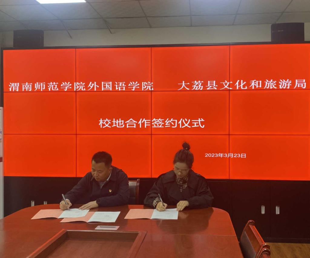 3月23日上午,bat365正版唯一官网外国语学院与大荔县文化和旅游局校地合作签约仪式在大荔县文化和旅游局会议室进行。大荔县文化和旅游局局长贺康平,外国语学院副院长李圣恩、李军胜,科研秘书王晓旭出席签约仪式。