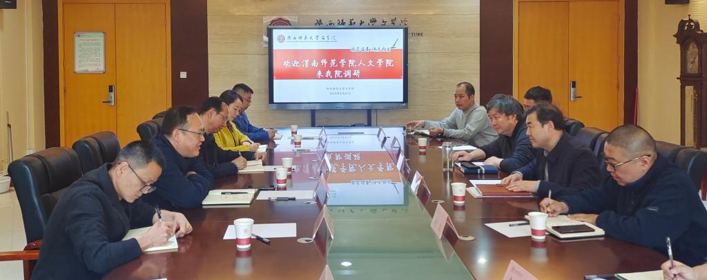 3月31日下午,人文学院党政班子成员和部分专业负责人一行到陕西师范大学文学院展开调研活动。陕西师范大学文学院党委书记闫文杰、院长苏仲乐、副院长李跃力、赵文、王同亮等参加座谈。双方围绕基层党建、学科科研、教学建设、行政工作等方面进行了全面深入交流。
