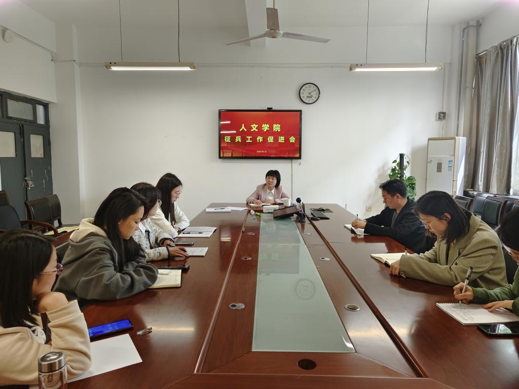 4月12日下午,人文学院召开2023年春季征兵工作促进会,党总支副书记、副院长张晶主持会议,该院全体辅导员参加会议。