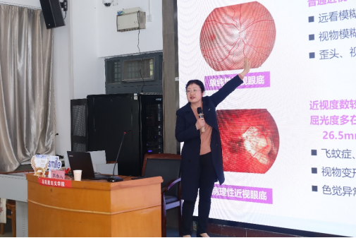 田瑾以《久久为攻、共守光明未来》为题,讲解了各年龄段,特别是青年阶段容易产生的不健康视觉及其可能引起的眼疾、其它并发疾病,呼吁师生一定要重视、要学会正确用眼、保护眼睛、保护视力、正确矫正视力。随后,田医生分析了近视产生的各种原因、近视的危害,讲解了眼睛的结构、常见眼疾及其预防于治疗、近视及其预防、高度近视的危险行为、近视眼镜的选择、近视的各种治疗方式及其适应性等师生特别关注的眼睛健康知识。田医生还带来了自己的科普团队,在讲座后同师生进行了更为深入、广泛、具体的互动交流。