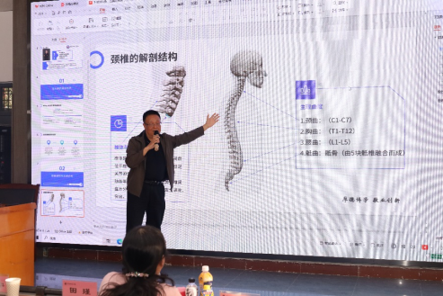 雷广宇以《不做低头族,远离颈椎病》为题,讲解了人体颈椎结构、脊柱结构、学生常见颈椎病及其发病原因,介绍了颈椎病的日常预防方法、椎间盘病的类型及其治疗不同治疗方式等内容。