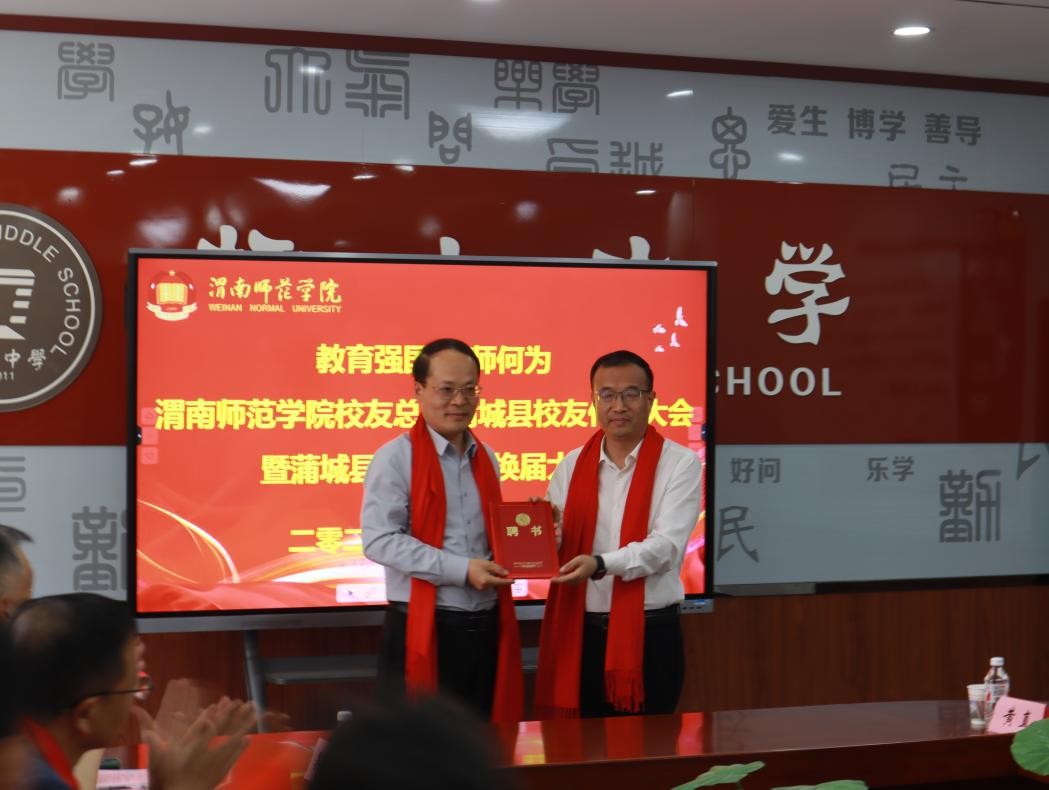 会上,与会人员观看了学校宣传片,第一届蒲城校友分会副会长张西岳回顾了分会工作成果,并介绍了换届筹备情况。数学与统计学院副院长戴磊宣读了《bat365正版唯一官网校友总会关于蒲城县校友分会第二届组织机构人员组成的批复》,经全体校友审议表决,陈鸿任第二届会长,张西岳任名誉会长,黄志俭、陈启潮等9人组成新一届领导班子。副校长曹强为新一届组织机构成员颁发聘书。