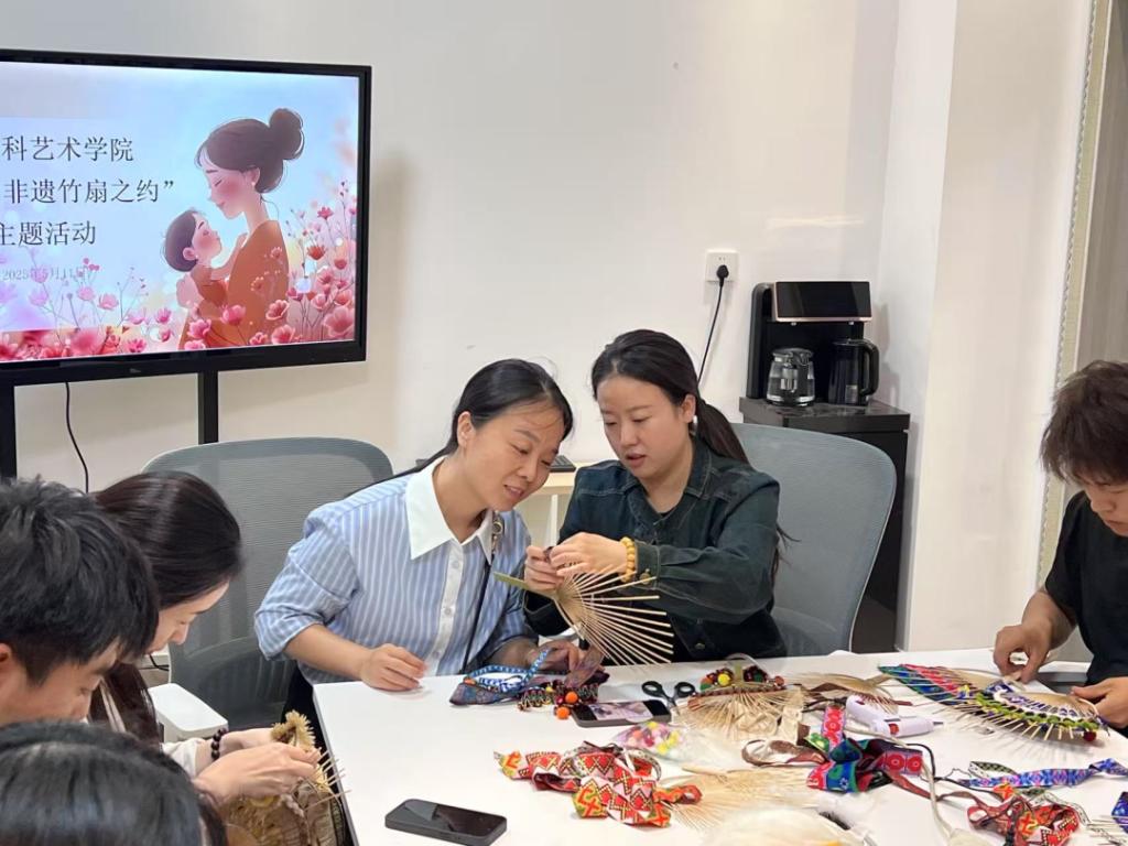 活动现场,温馨氛围浓厚。工作人员详细讲解并示范竹扇制作工艺,从竹材的精心挑选,到切割、编织、装饰等步骤,动作娴熟利落、精准细致。师生们围坐在一起,认真聆听、动手实践,将对母亲的爱融入每一道制作工序中。
