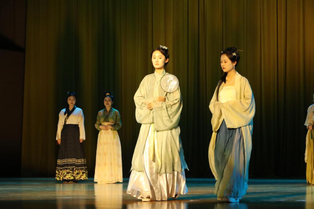 服装走秀节目中,戏剧影视美术设计专业众多同学身着由专业老师指导自己设计的时尚华服,自信地走上舞台。他们步伐矫健,姿态优雅,或灵动活泼,或成熟大气,充分展现了传媒学子的青春风采与时尚品位,将现场氛围推向高潮。随后,张洋带来的快板《双锁山》,凭借精湛的技艺和生动的表演,赢得了观众的阵阵掌声,其节奏明快,语言诙谐幽默,展现了传统艺术的独特魅力。