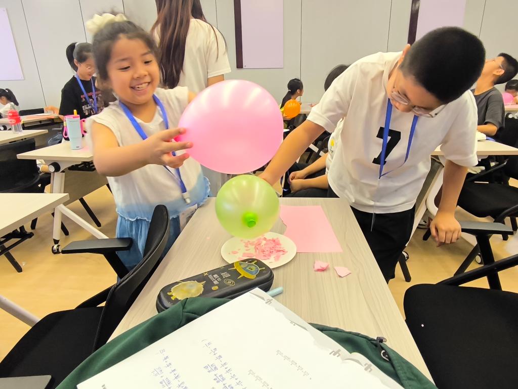7月7日开班仪式后,孩子们在科学实验课上开启了求知之旅。王佳荣老师的“漂浮瓶”“泡泡龙”实验让孩子们亲手触摸科学奥秘,张阳楠老师的“摩擦生电”系列实验则以奇妙现象点燃好奇心。这场沉浸式体验不仅揭开了科学的神秘面纱,更在孩子们心中种下了“敢于探究、乐于发现”的种子。