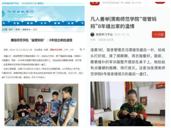 用心用情,践行服务宗旨,实事好事温暖人心。通过设立“春晖宿舍”,扩大“宿管阿姨”缝补队伍、开展“我为孩子叮嘱一句话”等系列活动,暖心服务育人。为了更好地照顾伤病、腿脚不便的同学,在每栋公寓一层设置了一间“春晖宿舍”,设置单层床铺、学习桌,提供常规跌打损伤用品、拐杖、便捷马桶等。公寓科结合实际,自发组建了一支爱心织补队伍,多年来逐渐覆盖全校公寓,长期为学生免费缝补衣物。一针一线总关情,宿管阿姨的爱心举动先后受到“学习强国”学习平台、陕西省教育厅门户网站、中国青年报等媒体以《一针一线 “宿管妈妈”8年缝出家的温情》为题的报道。通过设置宿管体验岗开展实践育人。学生公寓作为学校治理的重要阵地,是开展实践育人的重要场所。为深化学生劳动教育理念、培养劳动实践技能、提高劳育成效,按照勤工助学安排,开辟宿管体验岗,安排学生参与公寓安全、文明、卫生“三达标”检查、住宿信息核查及来访、报修、消杀登记等工作,让学生亲身体验宿舍管理事务的琐碎繁杂,激发学生尊重劳动成果、尊重劳动者的道德情操。