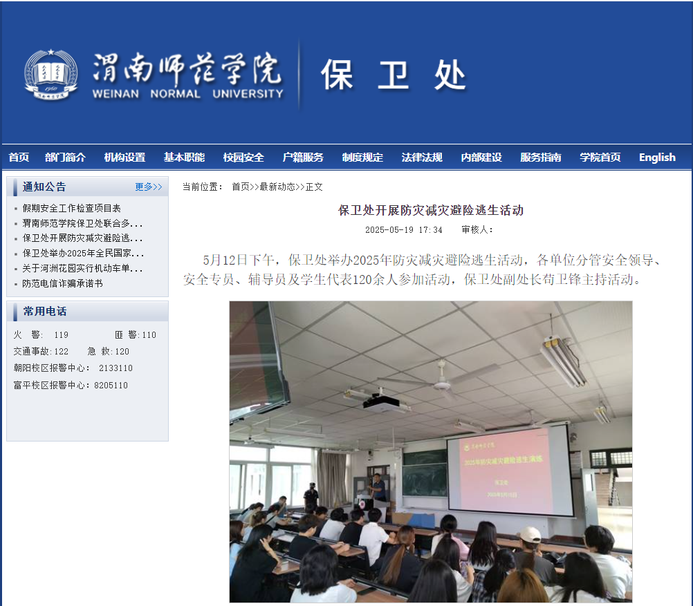 加强与渭南市国家安全局、内保大队、交警大队、临渭分局站南派出所、富平县东华派出所的沟通协调,积极开展国家安全、反电诈、禁毒宣传月、安全生产月等各类宣传教育活动。积极开展校园电动车专项治理行动,增划了安全停车区域,启动电动车校园通行标识办理工作。同时进一步加强校园机动车管理,制作悬挂有序停放提示标牌,强化违停处置,有效实施“缓堵保畅”。严格门禁管理,实行进入校园验证制度,陌生人来访登记率达100%,对外来车辆进行开箱检查,把好入口关。开展了实验室安全大检查活动;对朝阳校区大门外的出租车乱停乱放、拉客及商业摊位进行了专项治理;积极开展矛盾纠纷排查和安全隐患排查,组织校内商业网点安全专项检查6次,排除安全隐患30余处。统筹安排,精心组织,实现重点区域化专人盯防,圆满完成四六级英语考试、审核评估、田径运动会等安全保卫工作。