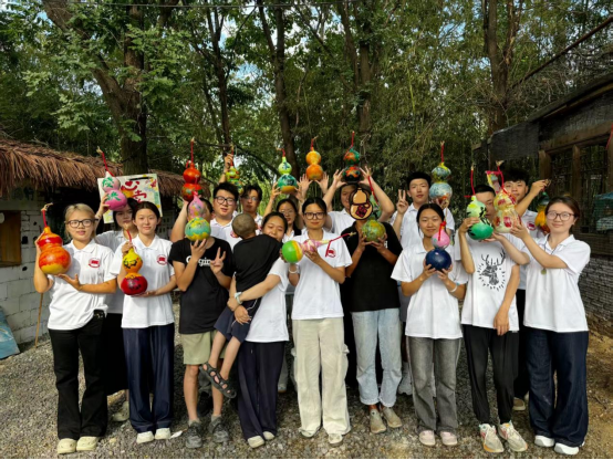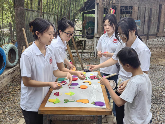 团队始终将“暖心服务”作为行动指南,用真诚与耐心陪伴特殊儿童成长。面对特殊儿童的差异化需求,成员们坚持一对一指导,在非遗课程中手把手教孩子们绘制漆扇、创作青花瓷贴画;在户外活动中时刻关注孩子们的安全与状态,用细致关怀消除他们的紧张与不安。7月9日,外籍教师加入支教队伍,与团队成员共同开展青花瓷贴画课程,中外教师默契配合,让孩子们在跨文化互动中感受非遗魅力,这样的创新实践正是团队勇于担当、积极作为的体现。