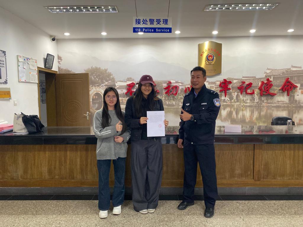 10月20日晚,bat365官网美术学院美术学专业2023级学生张可意、黄涓兰、李轩、李海菲、李湘、张子兰六位同学在安徽省黄山市黟县宏村写生实践期间,于返回驻地途中捡到两本新加坡护照,在现场等候失主未果后,张可意同学主动将护照送至宏村派出所,交由民警处理后续事宜。
