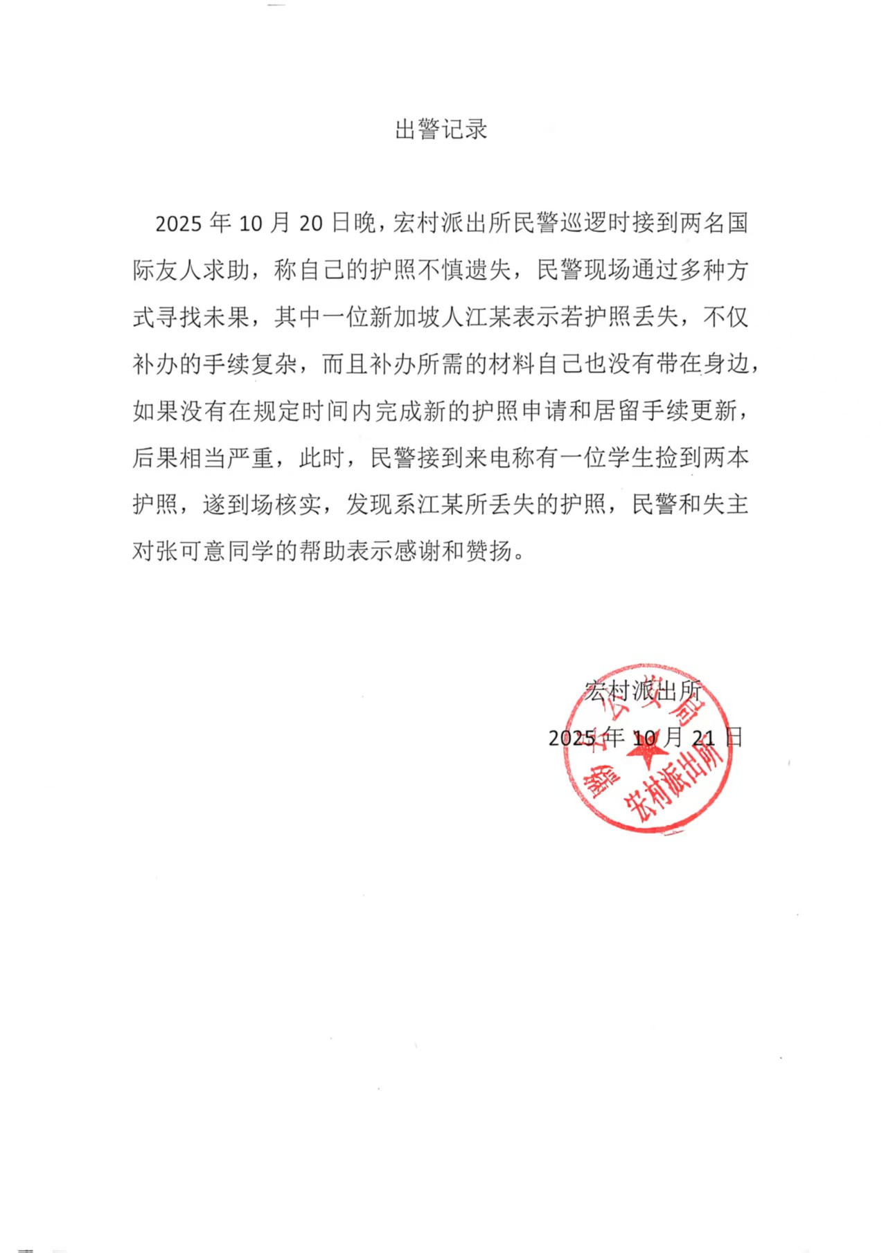 尤为可贵的是,张可意等同学在完成这项善举后,返回写生基地并未向任何人提及此事,仍如常投入专业学习。直至驻地派出所专程致电学院带队教师,表示已通过护照信息顺利联系到新加坡失主,并特别表扬bat365官网学生拾金不昧、处事得当的优秀品质,学院方知悉这一好人好事。