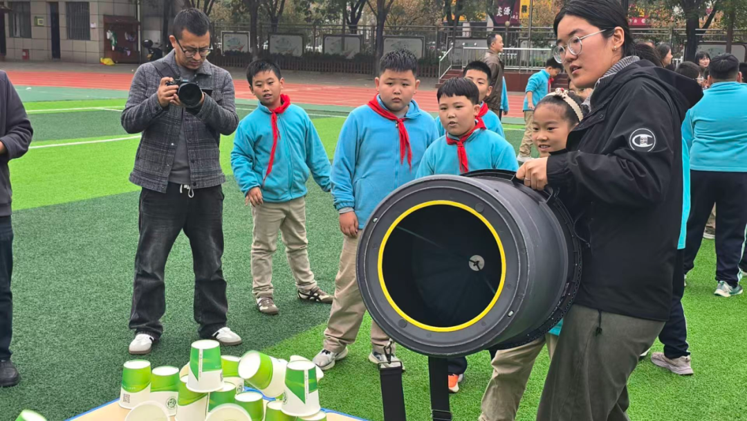 活动聚焦“体验科学魅力 提高孩子兴趣”,精心设计奇妙的科学实验。当实验小组的成员们转动仪器产生“火龙卷”时,引得全场惊叹;当“陀螺仪”平稳地定在半空中时,孩子们摩拳擦掌跃跃欲试;而威力十足的“加特林机枪”发射出弹球,将全场氛围推向高潮。每一个小实验都将理论知识直观地展示在孩子们面前,让孩子们在视觉震撼中探索科学的奥妙。
