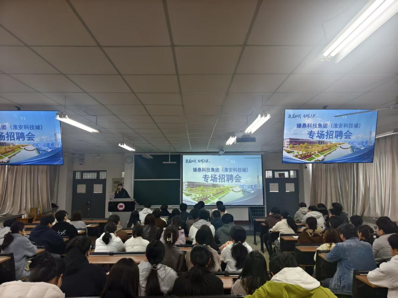 3月24日,物理与电气工程学院特邀臻鼎科技集团(淮安科技城)进校举办专场招聘会。学院党总支书记袁卫、院长秦玉伟、党总支副书记权轻舟及毕业班辅导员参加活动。经前期广泛宣传动员,物理与电气工程学院、外国语学院、数学与统计学院、化学与材料学院、计算机学院近100名毕业生参加现场宣讲应聘。