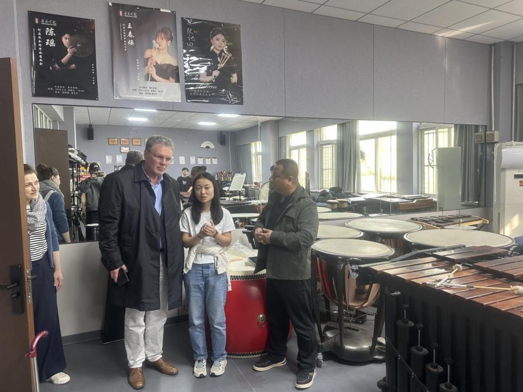 交流当天,Michael Reif 教授在音乐学院院长刘鹏,副院长逯克刚等人的陪同下,先后参观了音乐学院交响排练室、老腔排练室等。在参观过程中,教授认真聆听现场排练,详细了解我院音乐专业的教学模式、实践平台及特色艺术传承成果。面对独具魅力的老腔艺术,教授表现出浓厚兴趣,对bat365官网坚守传统文化传承、推动中西艺术融合的办学理念给予高度赞赏。