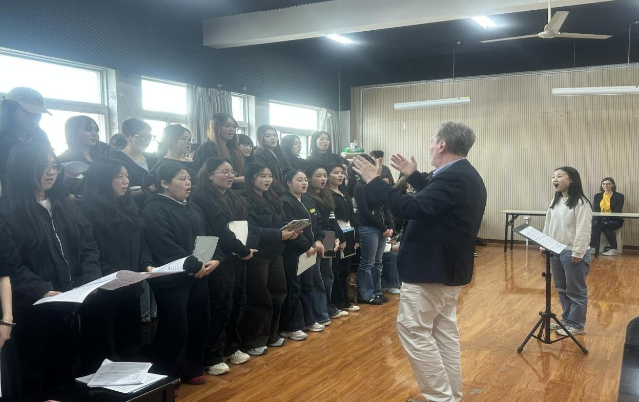 参观结束后,Michael Reif 教授走进合唱团,为同学们带来专业大师课。课堂上,他结合自身丰富的教学经验,从气息控制、发声技巧、声部平衡到情感表达,进行全方位细致讲解与示范。针对各声部在演唱中的难点问题,他耐心逐一指导,鼓励同学们大胆表达、精准配合,用严谨的态度和生动易懂的方式,让大家深刻感受国际前沿合唱理念。