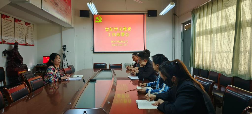 4月15日下午,体育学院党总支召开党纪学习教育工作部署会,党总支委员、各支部书记、党务秘书等人参会,总支书记李春兰主持会议并讲话。