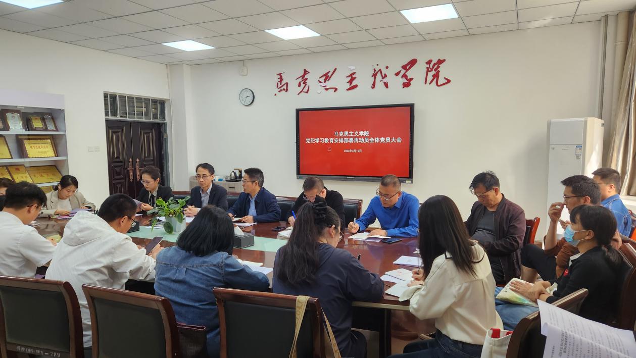 4月19日下午,马克思主义学院召开了党纪学习教育安排部署再动员全体党员大会,组织了党纪学习教育第一次全体党员集中学习。全体党员参加会议,党总支书记赵国峰主持会议。