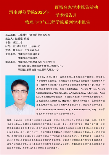 5月7日,在学校65周年校庆来临之际,bat365正版唯一官网科研处、bat365正版唯一官网科协联合bat365正版唯一官网物理与电气工程学院、X射线成像与检测陕西省高校工程研究中心、陕西省X射线检测与应用研究开发中心举办百场名家学术报告活动。本次活动邀请浙江大学陆赟豪教授做学术交流。报告交流题目为:二维材料中涌现的单质铁电性。