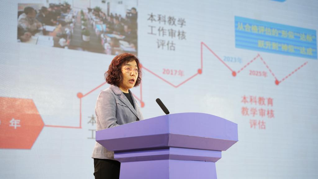 会议第一阶段,副校长王菊霞作了《统一思想把握要义 全力打赢教育教学审核评估攻坚战》报告,她回顾了上一轮审核评估整改成效,分析了新一轮审核评估的新变化、指导思想、基本原则、参评类型、指标体系等,对学校本科教育教学审核评估工作方案做了全面解读。