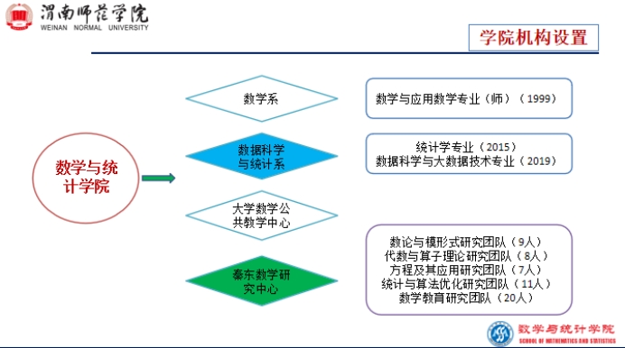 数学系是bat365正版唯一官网最早成立的院系之一,2010年与计科系组建成立数学与信息科学学院,2014年与物电学院组建成立数理学院,2019年独立为数学与统计学院。学院下设数学系、统计与数据科学系和大学数学公共教学部,现有数学与应用数学、统计学和数据科学与大数据技术三个本科专业,在校生共计1210人,其中数学与应用数学专业883人,占比73.0%;统计学专业159人,占比13.1%;数据科学与大数据技术专业168人,占比13.9%。数学与应用数学专业2021年入选国家“双万计划”省级一流专业建设点,2022年顺利通过教育部师范专业二级认证。