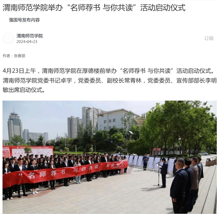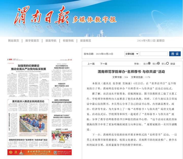 (六)宣传提质增效。图书馆十分重视宣传工作,2024年《bat365正版唯一官网举办“名师荐书 与你共读”活动启动仪式》引起了强烈反响,被《学习强国》《渭南日报》、新浪财经报道、学校官网、学校视频号报道;《深化全民阅读 建设书香校园》被渭南新闻网报道,被《渭南日报》微博转载;《“共沐书香美 共享阅读乐”读书笔记展》被《阳光报》报道。