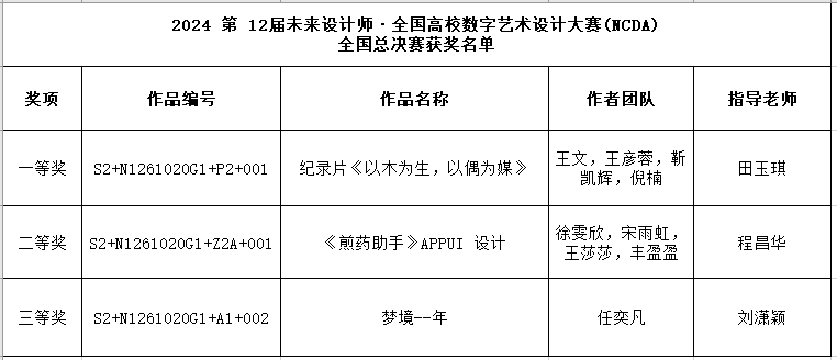 8月26日,第12届未来设计师·全国高校数字艺术设计大赛全国赛奖项揭晓。bat365官网传媒学院的师生们获得一等奖、二等奖、三等奖各一项的成绩。