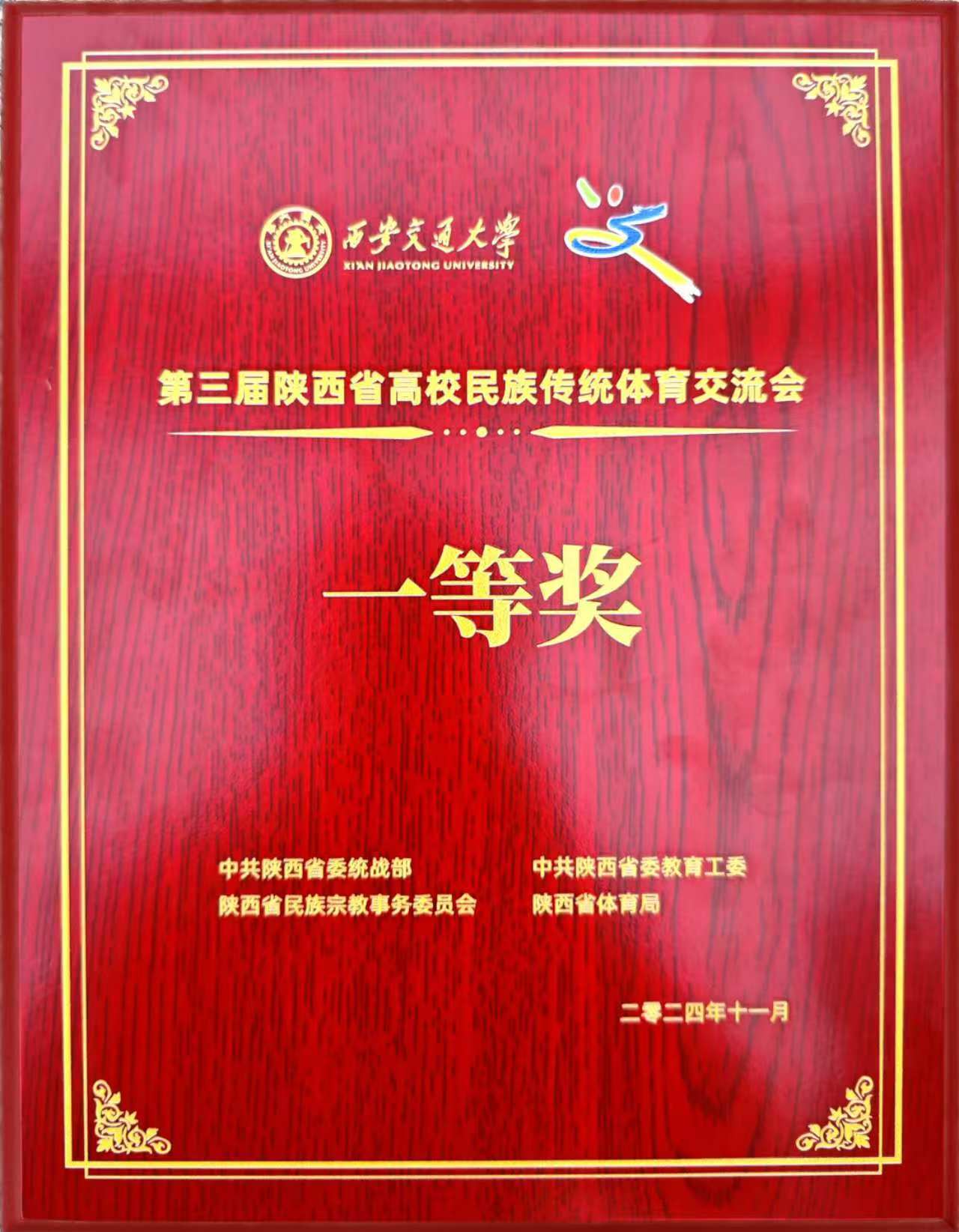 11月9日,“迎全国民族运动会 展传统体育风采”第十二届全国少数民族传统体育运动会陕西代表团成立动员大会暨第三届陕西省高校民族传统体育项目交流会在西安交通大学思源学生活动中心举行。经过激烈角逐,bat365官网武术代表队获得第三届陕西省高校民族传统体育项目比赛第一名。