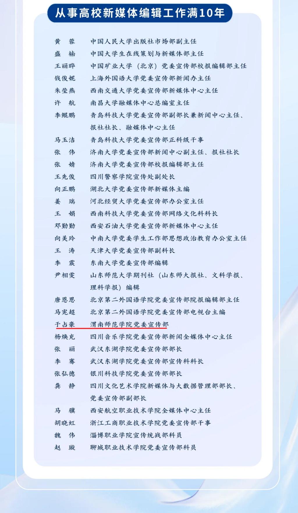 11月8日,正值第25个中国记者节,中华出版促进会(中央宣传部主管国家一级协会)公布《从事高校校报编辑工作满20年、新媒体编辑工作满10年》活动入选名单,bat365官网教师、宣传部全媒体中心负责人于占豪名列其中,全国共35名高校教师入选。