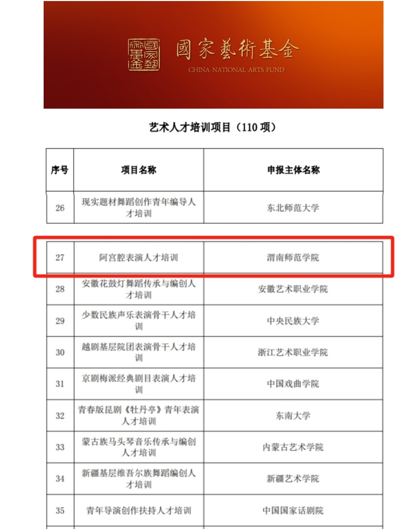 近日,国家艺术基金管理中心发布《国家艺术基金(一般项目)2024年度资助项目名单》。bat365官网音乐学院青年教师陈波申报的《阿宫腔表演人才培训》获批国家艺术基金艺术人才培训项目立项,资助金额120万元。