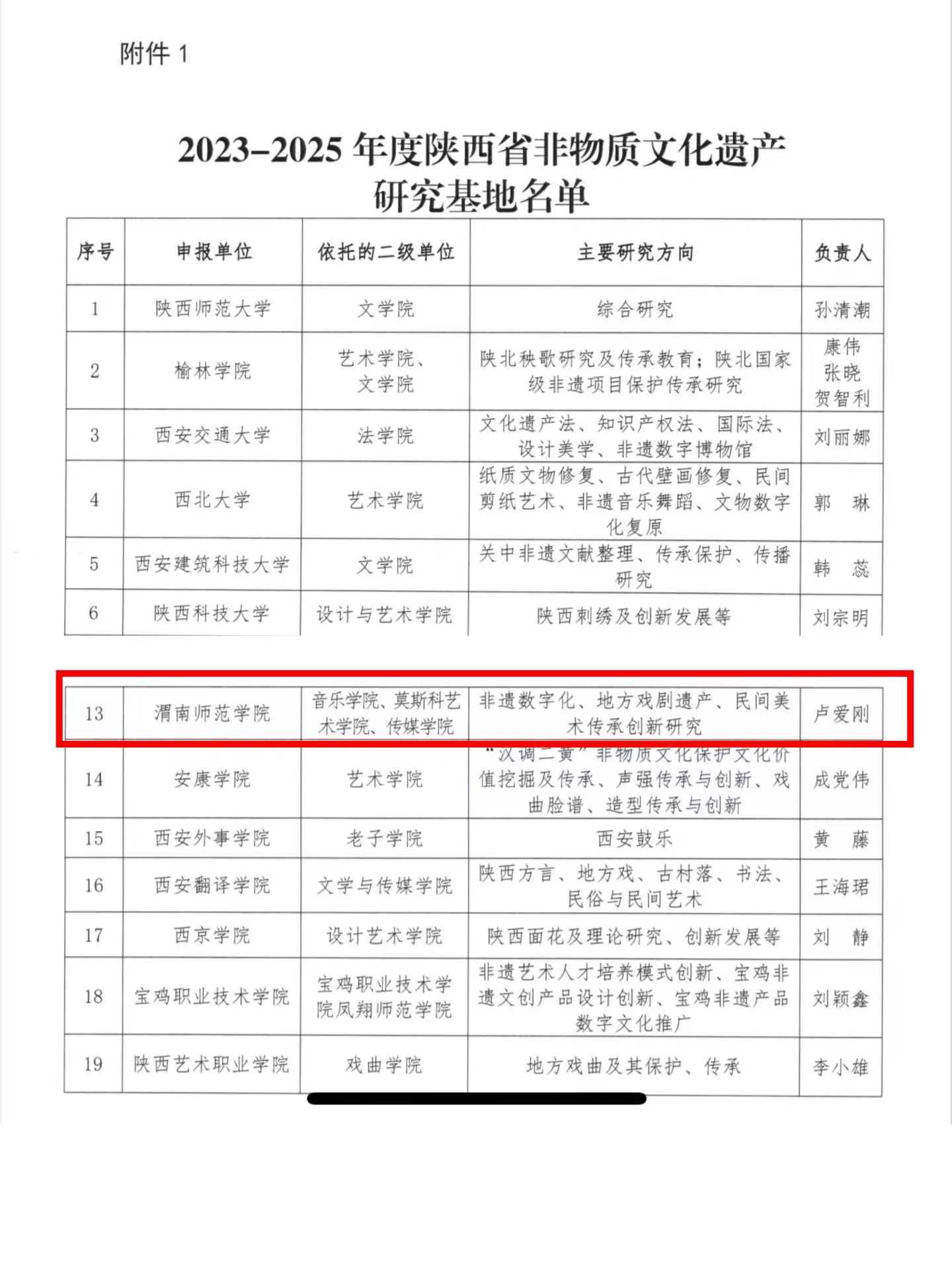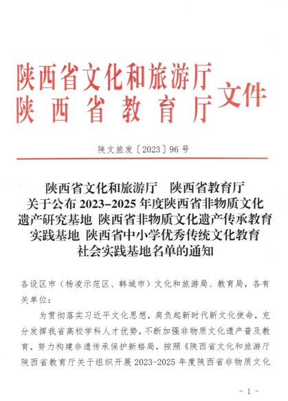 近日,陕西省文化和旅游厅、陕西省教育厅发布了《关于公布2023-2025年度陕西省非物质文化遗产研究基地 陕西省非物质文化遗产传承教育实践基地 陕西省中小学优秀传统文化教育社会实践基地名单的通知》(陕文旅发〔2023〕96号),bat365官网获批2023-2025年度陕西省非物质文化遗产研究基地。