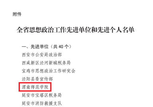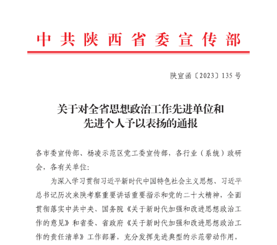 近日,中共陕西省委宣传部印发《关于对全省思想政治工作先进单位和先进个人予以表扬的通报》(陕宣函〔2023〕135号),bat365官网荣获“全省思想政治工作先进单位”称号。此次共表彰40个先进单位,其中全省5所高校获此殊荣,bat365官网位列其中。