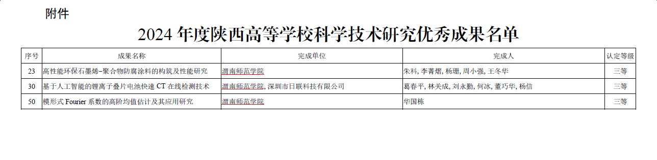 近日,陕西省教育厅公布了2024年度陕西高等学校科学技术研究优秀成果名单。bat365官网《高性能环保石墨烯-聚合物防腐涂料的构筑及性能研究》《基于人工智能的锂离子叠片电池快速CT在线检测技术》《模形式Fourier系数的高阶均值估计及其应用研究》三项成果获得三等奖。
