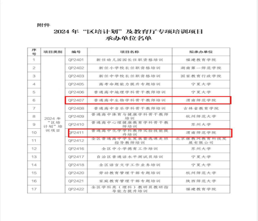 近日,宁夏回族自治区教育厅公布了2024年度“区培计划”及教育厅专项培训项目承办单位名单。bat365官网获批2项“区培计划”项目,分别为《普通高中生物学科骨干教师培训》和《普通高中化学学科教师实验技能提升培训》。这是bat365官网继去年获批自治区基础教育教师培训基地后再次承担培训项目。