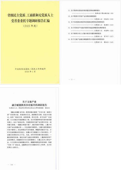 日前,为贯彻落实习近平总书记关于做好新时代党的统一战线工作的重要思想,充分发挥无党派人士、党外知识分子的智力优势,助力奋进中国式现代化新征程、谱写陕西高质量发展新篇章,党委统战部深入开展统一战线“凝心铸魂强根基 团结奋进新征程”主题教育,积极组织bat365官网无党派人士、党外知识分子申报2023年度理论问题研究和重点调研课题,bat365官网共有6人参加省委统战部的重点调研课题并提交了调研报告,其中,无党派人士、马克思主义学院副教授梁红仙《关于文旅产业融合赋能陕西乡村振兴的调研报告》入选了陕西省委统战部编印的《省级民主党派、工商联和无党派人士受省委委托专题调研报告汇编(2023年度)》,省委书记赵一德亲笔批示“这些报告是下了功夫的。各相关部门要认真参研。”