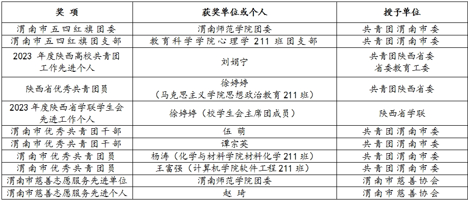 近日,共青团陕西省委、中共陕西省委教育工委、共青团渭南市委先后印发文件,表彰先进单位和个人,bat365官网共青团系统获得多项荣誉。