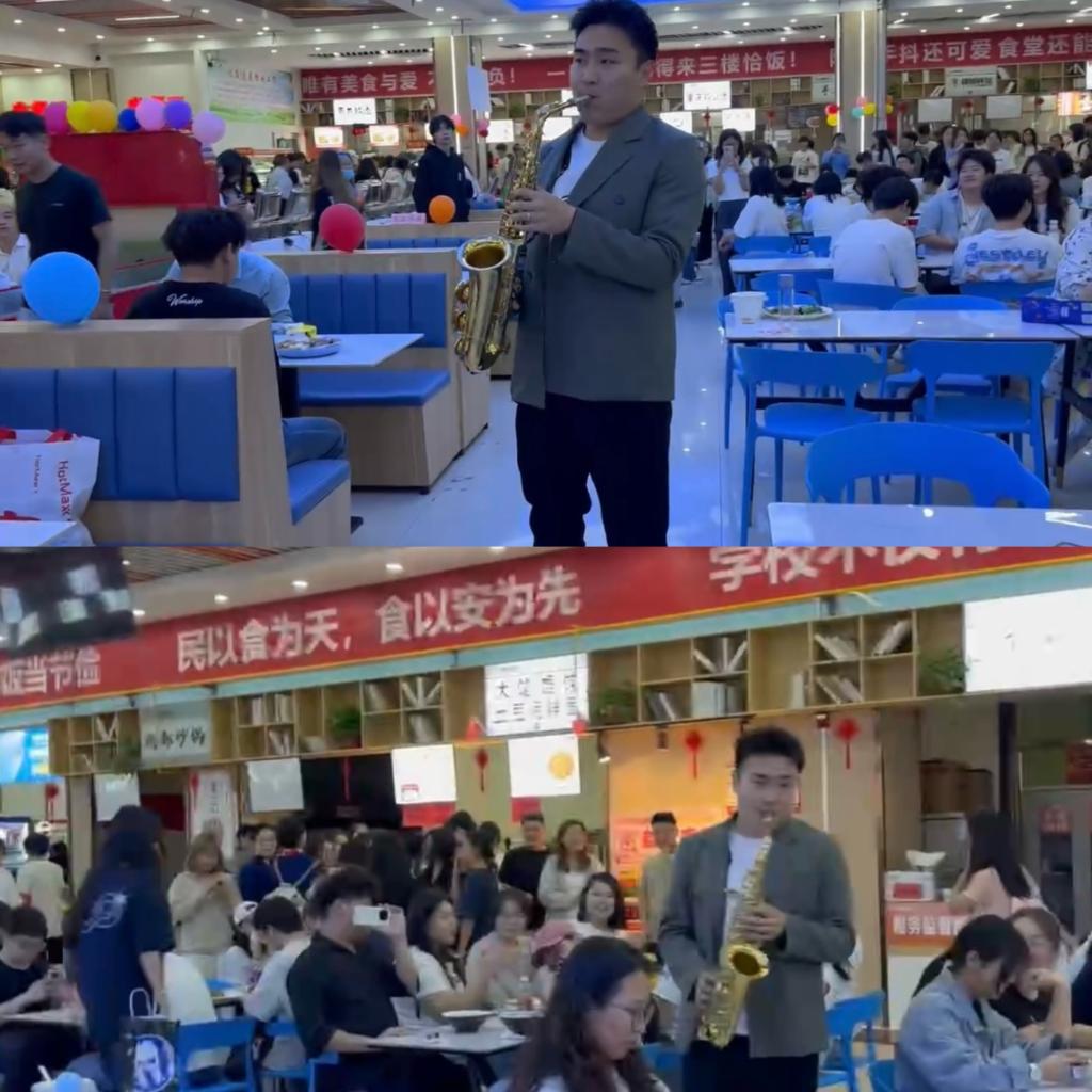 活动开始前,同学们有序就餐、轻松交谈。一段熟悉的音乐在餐厅角落响起,吸引了众人的目光。人文学院周伯晓老师怀抱萨克斯,吹响了优美的旋律,现场的校友以及同学们热情逐渐高涨,随着节奏拍手哼唱,随后,音乐学院王格老师带领合唱团同学们携手李静老师深情演唱《我爱你中国》,现场气氛达到了高潮,同学们的脸上洋溢着幸福与自豪。